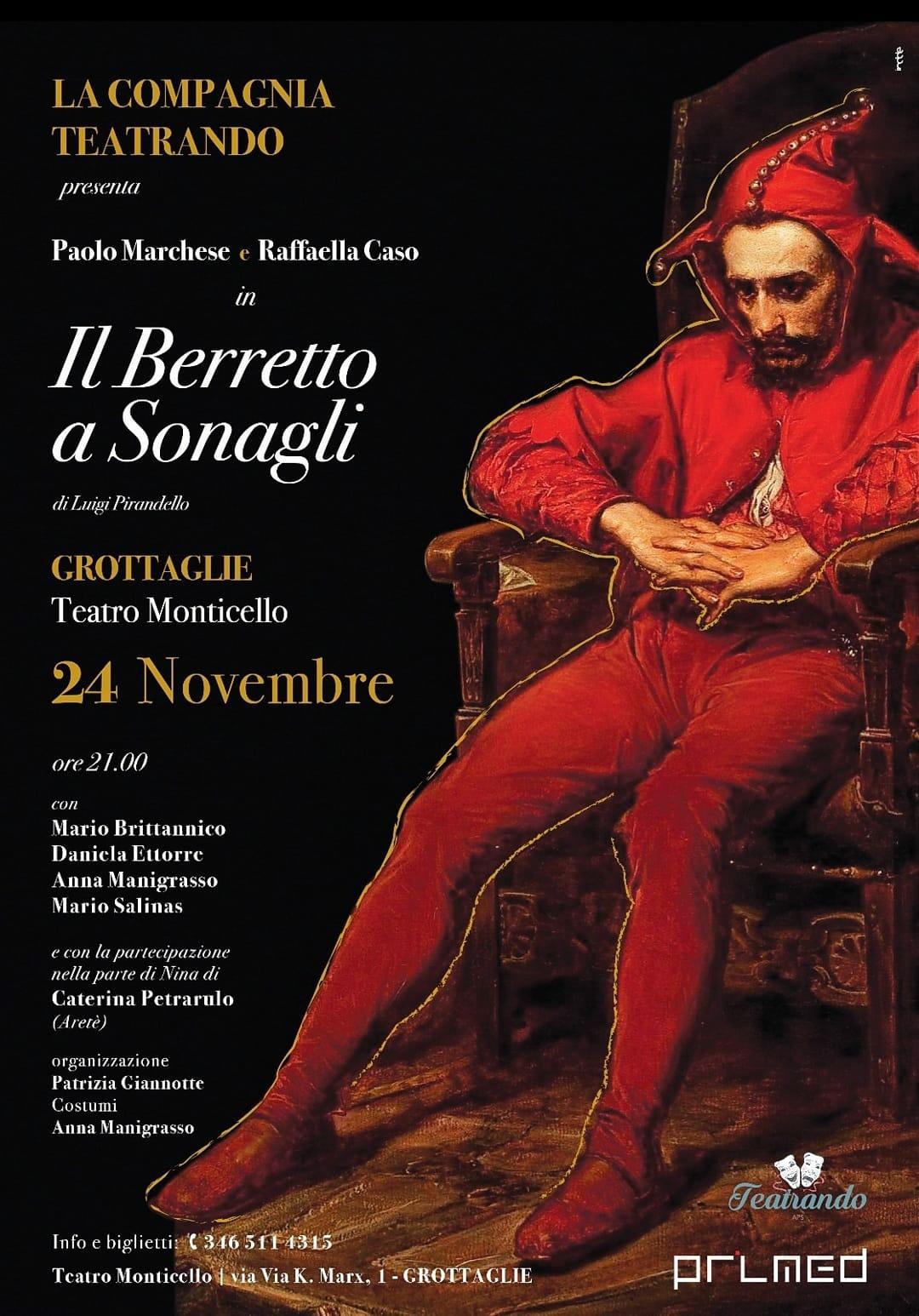 A Grottaglie la rappresentazione de “Il Berretto a Sonagli” della compagnia Teatrando si terrà, con inizio alle ore 21.00, sabato 24 novembre presso il Teatro “Monticello”, in via Karl Marx n.1.
