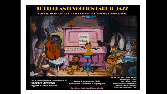 TERLIZZI (Bari) – “Tutti quanti voglion fare il jazz” è il titolo scelto per esplicitare i contenuti di un progetto/spettacolo che si svolgerà sabato 5 gennaio alle 19:00 presso la Scuola elementare “Don Pietro Pappagallo” di Terlizzi, la cui finalità è quella di avvicinare alle sonorità jazz i bambini attraverso l’esecuzione delle colonne sonore del grande cinema d’animazione.