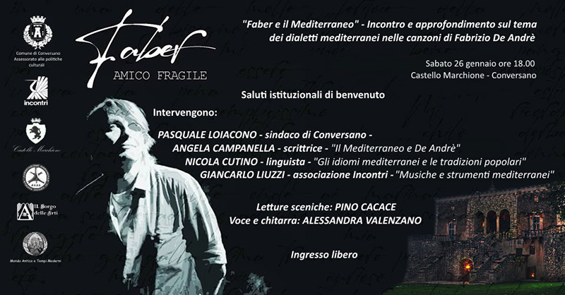 L’evento dal titolo: “Faber e il Mediterraneo” previsto per sabato 26 gennaio dalle ore 18.00 a Castello Marchione, casino di caccia dei conti Acquaviva d’Aragona, è organizzato dall’Associazione Culturale Incontri in collaborazione con le associazioni “Il Borgo delle Arti”, “Mondo antico Tempi moderni” e A.N.A.S. Puglia e prevede un incontro di approfondimento sui dialetti mediterranei e sulla ricerca musicale di Fabrizio De Andrè, ricordando in particolare l’album “Crêuza de Mä” scritto a quattro mani con Mauro Pagani, nel quale gli autori in una sorta di “piccola Odissea” fanno rivivere quel Mediterraneo antico che dal Bosforo a Gibilterra ha portato e porta con se storie di marinai, lingue, racconti e tradizioni.