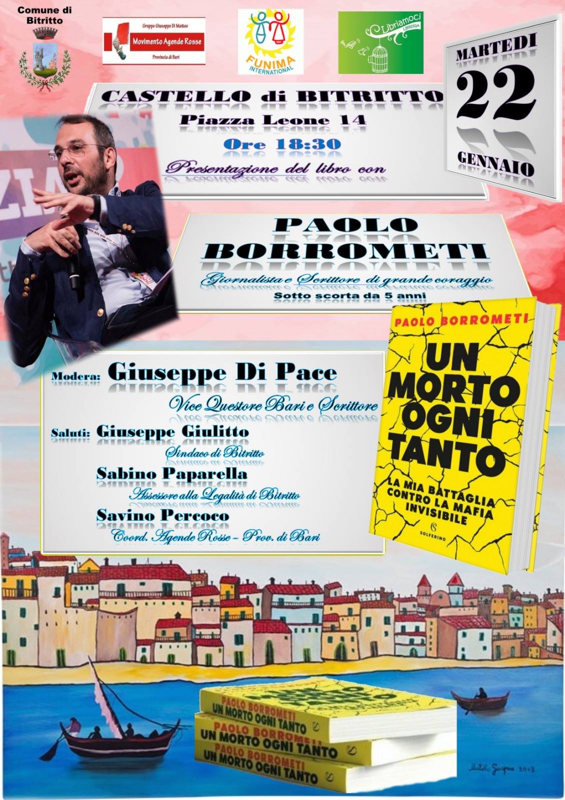 BITRITTO (Bari) – Martedì 22 Gennaio, ore 18.30, presso il Castello di Bitritto, sito in piazza Leone 14, Paolo Borrometi presenta il libro “Un morto ogni tanto”.