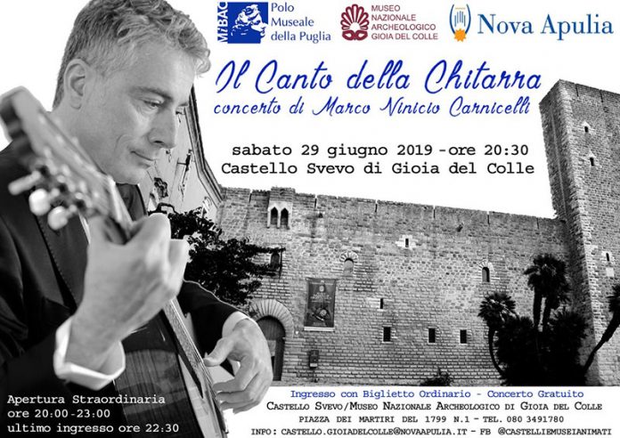 GIOIA DEL COLLE (Bari) – Nell’ambito delle aperture straordinarie serali indette dal MiBAC in tutti i luoghi della cultura statali, sabato 29 giugno alle ore 20.30 il Museo Archeologico Nazionale – Castello di Gioia del Colle ospiterà il concerto Il canto della chitarra del Maestro Marco Vinicio Carnicelli.
