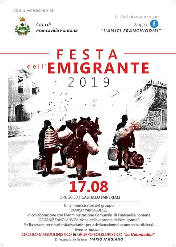 FRANCAVILLA FONTANA (Brindisi) – Sabato 17 agosto alle 20.30 Castello Imperiali ospiterà la IV Edizione della Festa dell’Emigrante.
