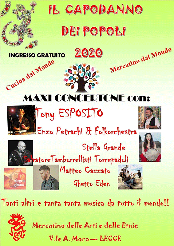 LECCE – Il primo gennaio, il Mercatino delle Arti e delle Etnie ospiterà “Il Capodanno dei Popoli” nel nome dell’uguaglianza e dell’unione. Dalle 18.30 la grande location a cielo aperto, sita in viale Aldo Moro a Lecce, darà il benvenuto al nuovo decennio con la rassegna musicale che vedrà esibirsi sul palco del Mercatino Multietnico una serie di artisti in un tourbillon di emozioni contrastanti tra folk, jazz, pop, pizzica e reggae. Tony Esposito, noto cantautore e percussionista di lungo corso, riscalderà il pubblico nell’ambito di una serata in cui si esibirà anche Enzo Petrachi accompagnato dalla FolkOrchestra. Il maxi concerto proseguirà sino all’una di notte con le performance di Salvatore Crudo dei Tamburellisti di Torrepaduli, la pizzica di Stella Grande, la voce di Matteo Cazzato (ex di Amici) e l’energia dei Ghetto Eden. Ingresso libero.