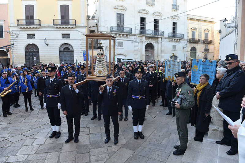 Una folla di fedeli visibilmente emozionati e una rappresentanza del personale della Base Militare di Galatina e delle Associazioni d’Arma Aeronautica della provincia di Lecce, hanno accolto la statua in Piazza San Pietro e l’hanno accompagnata, con una breve processione, nell’antica Basilica, gioiello dell’arte romanica, per la celebrazione eucaristica.