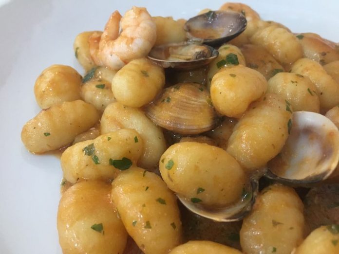 Versare gli gnocchi nella padella con le vongole e i gamberetti, se necessario aggiungere qualche cucchiaio diacqua di cottura e amalgamare