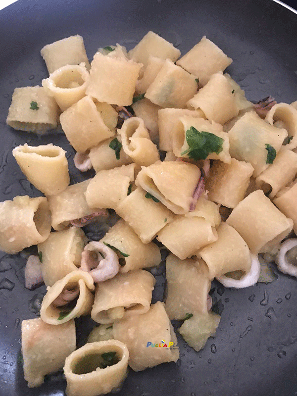 Lessate i paccheri e quando saranno pronti, finite la cottura nella padella con le patate e i calamari. Condite con il trito di aglio, il prezzemolo e con la scorza di limone grattugiata.