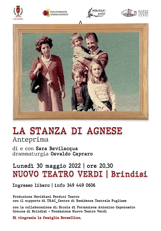 BRINDISI – «È bello morire per ciò in cui si crede; chi ha paura muore ogni giorno, chi non ha paura muore una volta sola». Sono parole di Paolo Borsellino, parole cristallizzate nella memoria della civiltà. Sono passati quasi trent’anni da quel torrido 19 luglio 1992 che in via D’Amelio, a Palermo, segnò la fine di un simbolo della giustizia, il giudice Paolo Borsellino, e degli agenti della sua scorta. Oggi la memoria di un eroe dell’antimafia diventa uno spettacolo, dal titolo “La stanza di Agnese”, in programma in anteprima nazionale lunedì 30 maggio, con inizio alle 20.30, nel Nuovo Teatro Verdi di Brindisi. Il lavoro, di e con Sara Bevilacqua, per la drammaturgia di Osvaldo Capraro, è prodotto dalla compagnia Meridiani Perduti Teatro con il sostegno del Comune di Brindisi e il supporto del TRAC – Centro di Residenza Teatrale Pugliese -, della Scuola di Formazione Antonino Caponnetto e della Fondazione Nuovo Teatro Verdi. L’ingresso è libero con obbligo di indossare la mascherina FFP2. Info 349 449 0606.