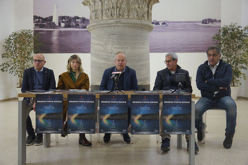 BRINDISI – È stata presentata questa mattina nella sala del Capitello di Palazzo Granafei-Nervegna “Brindisi Porto Natale”, la rassegna dedicata al tema della pace e del dialogo tra i popoli organizzata dal Comune di Brindisi e dalla Fondazione Nuovo Teatro Verdi, con la partecipazione del Distretto Urbano del Commercio di Brindisi “Brundisium”. L’incontro si è svolto alla presenza del sindaco di Brindisi, Riccardo Rossi, dell’assessore al Turismo, Emma Taveri, dell’assessore alle Attività Produttive, Massimo Vitale, del presidente del Duc, Oreste Pinto, e del direttore artistico del Nuovo Teatro Verdi, Carmelo Grassi.