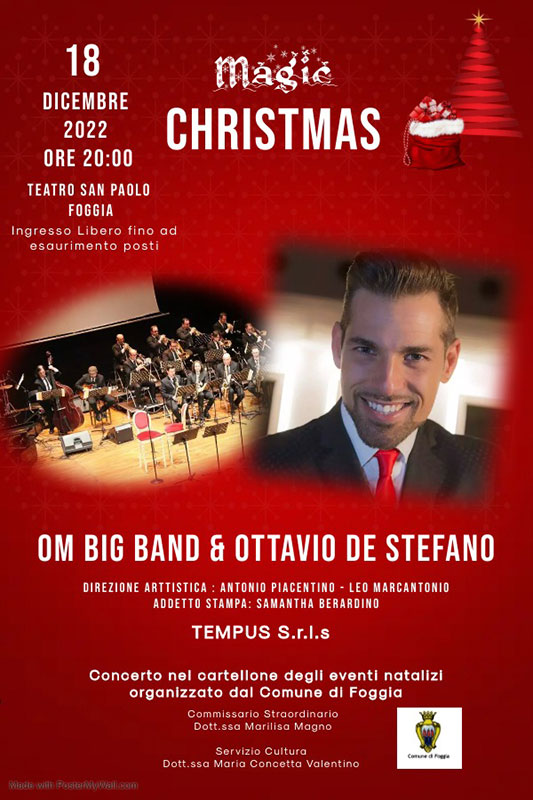 Sono loro, la OM Big Band e Ottavio de Stefano gli attesissimi ospiti che domenica 18 dicembre, a partire dalle ore 20, si esibiranno presso il Teatro San Paolo, meravigliosamente ristrutturato di recente, per il concerto “Magic Christmas”, prodotto da Tempus srls, nel cartellone degli eventi natalizi organizzato dal Comune di Foggia, grazie alla Commissione straordinaria presieduta da Marilisa Magno e al Servizio Cultura diretto da Maria Concetta Valentino.