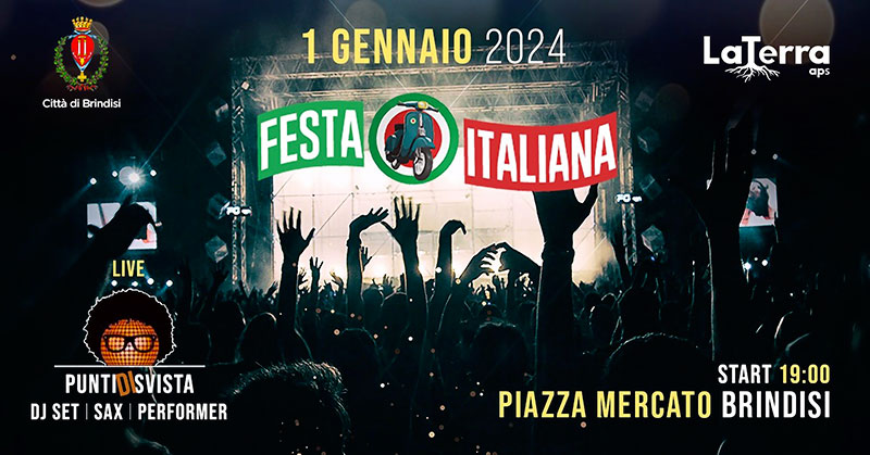 BRINDISI – Ha per titolo “Festa Italiana” ed è lo spettacolo in programma nel giorno di Capodanno a Brindisi in piazza Mercato, a partire dalle ore 19. L’evento fa parte della rassegna “Brindisi a Natale 2023” organizzata dal Comune di Brindisi. Dunque, la festa continua in piazza Mercato dopo il brindisi musicale della notte di San Silvestro con una lunga kermesse di musica e animazione che mescola show band, dj set e performer. Si comincia con il live set di Dario Spagnolo, in arte “Dario Esse“, dj e producer che presenta il nuovo singolo “Caballo de Mar” – etichetta Watt Musik – e incontra la performance sax di Luciano Scalinci, musicista in grado di esprimere una musicalità originale e alternativa. Cambio scena con l’arrivo dei “Punti di Svista“, band tutta brindisina che si distingue per la sua capacità di trasformare il concetto di musica live.