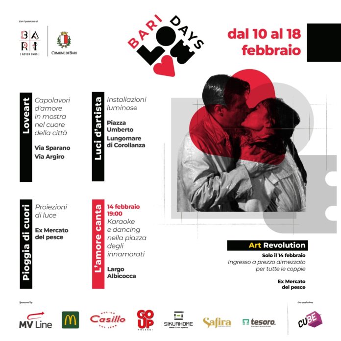 BARI – Nell’ambito di Bari Love Days – il programma di eventi prodotto da Cube Comunicazione realizzato grazie agli sponsor MVLine, McDonald’s Bari, Molino Casillo, Go Up, Sikurhome, Safira agency e Tesoro -, domani, mercoledì 14 febbario, giorno di San Valentino, la città di Bari celebra l’amore in tutte le sue espressioni, senza distinzioni o pregiudizi.
