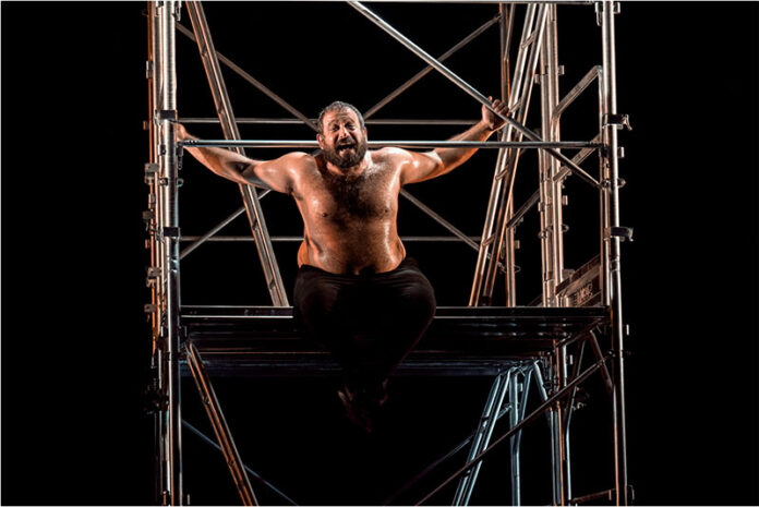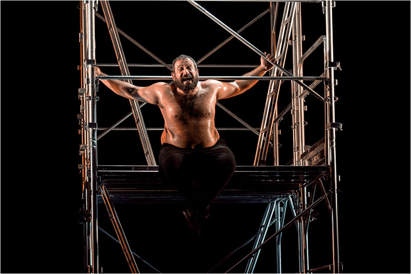 In una torre-gabbia ideata da Vincent Longuemare (che firma anche le luci), Michele Schiano di Cola, attore napoletano cresciuto alla scuola di Luca Ronconi, dà voce al protagonista di questa vorticosa opera del grande drammaturgo, indagatore di personaggi storici e mitici, in grado di lanciare in rotta di collisione i potenti e gli ultimi, uniti dalla corruzione del linguaggio e della storia stessa. Ed eccolo Barabba, con la voce rauca di quell’umanità che ha paura dell’altro, perché si sente continuamente minacciata, spiare da dentro il momento cruciale, per se stesso e l’umanità: la fatidica decisione della salvezza tra lui e Gesù.