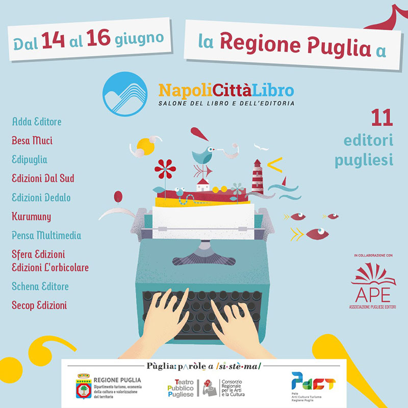 Proseguono le attività di Puglia, parole a sistema, linea di intervento della Regione Puglia attuata dal Teatro Pubblico Pugliese per valorizzare e promuovere il sistema dell’editoria regionale. Da giovedì 14 a domenica 16 giugno Regione Puglia partecipa a NapoliCittàLibro Salone del libro e dell’editoria con uno stand istituzionale, realizzato da Teatro Pubblico Pugliese in collaborazione con APE – associazione Pugliese Editori, che ospita 11 case editrici pugliesi che hanno partecipato ad una call pubblica: Besa Muci, Kurumuny, Pensa MultiMedia, Sfera Edizioni – Edizioni l’Orbicolare, Edizioni Dedalo, Edipuglia, Schena Editore, Adda Editore, SECOP edizioni e infine Edizioni dal Sud. NapoliCittàLibro offre una fitta quattro giorni nel segno delle Ri-generazioni, tema scelto per questa edizione, negli spazi della Stazione Marittima di Napoli con un ricco calendario di incontri, eventi e dibattiti.