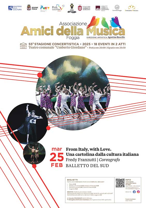 Il primo appuntamento in programma si terrà martedì 25 febbraio 2025 e vedrà il gradito ritorno della compagnia Balletto del Sud con “From Italy, with love. Una cartolina dalla cultura italiana”: uno spettacolo che celebra la cultura italiana e le atmosfere che è capace di evocare la musica del nostro Paese. Uno dei motivi di originalità di questo progetto, infatti, risiede proprio nella capacità di mescolare autori lontani tra loro per epoca e stile, eppure il risultato è estremamente armonioso e omogeneo, grazie alla riconoscibilità che la musica italiana possiede e che permette alla nostra produzione musicale (che si tratti di canzoni pop o di arie d’opera non fa differenza) di viaggiare in tutto il mondo. Vedremo, quindi, fondersi Verdi e Mina, Rossini e Bruno Lauzi, Mascagni e Battiato, in uno spettacolo che si propone come una passeggiata tra monumenti musicali che possono essere ammirati o riscoperti proprio con lo spirito di un turista pronto a lasciarsi incantare dalla bellezza. In scena, nell’atto unico, si esibiranno 20 danzatori su coreografie di Fredy Franzutti.