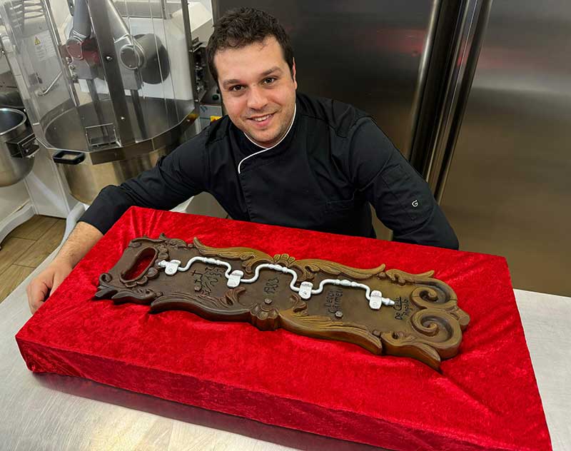 Un lavoro durato circa un mese, con l’obiettivo che fosse il più realistico possibile e su scala 1 a 1 per rispettare le misure di quella originale. «Ho realizzato la base in cioccolato fondente, poi ho usato quello al latte puro per tutti i lavori di intaglio e di intarsio. L’ho reso come una pasta e modellato, aiutandomi anche con attrezzi appuntiti in acciaio. In pratica delle dime con cui ho potuto riprendere tutti questi movimenti, sia ad esempio per lisciare questo composto a base di cacao e zucchero che per creare gli effetti concavi». Ma non è tutto: perché ha riprodotto anche le scritte originali, a cominciare dal nome di Angelo De Carlo, l’artigiano che nel 1983 ha scolpito l’originale, in legno, da cui Trisolini ha tratto ispirazione. Due generazioni a confronto: Gianluca, classe 1996 e Angelo, classe 1941. Due maestri: uno pasticcere, l’altro ebanista. Entrambi in grado di lasciare una traccia preziosa del loro lavoro.