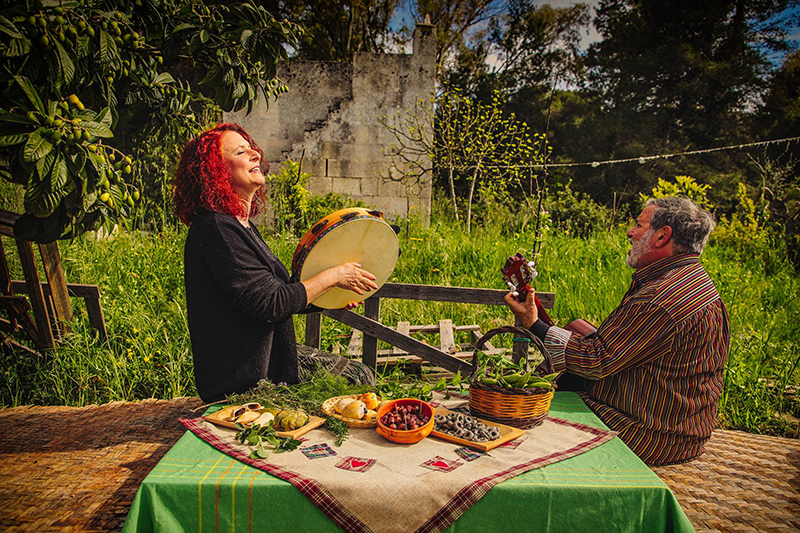 Qui si spalanca un mondo di sapori dimenticati: attorno a un antico casolare ottocentesco, circondato da frutti e fiori antichi, il giardino roccioso, l’orto, la vasca dei papiri egiziani i visitatori potranno degustare tisane a base di Bidens Aurea (coltivata sul posto) con cannella, cardamomo e chiodi di garofano, vino aromatizzato ai pruni selvatici, tortini alle erbe, crostini con creme di semi, foglie e fiori eduli, friselline con pesto di fave fresche e crostate con composta di frutti persi. Salvatore e Mariella spiegano come riconoscere le piante spontanee e usarle in ambito curativo, cosmetico, culinario e cerimoniale e poi  insieme alla figlia Letizia, con chitarre e tamburelli, danno il via a canti, pizzica e tarantelle, in un’atmosfera che rievoca le antiche feste rurali.