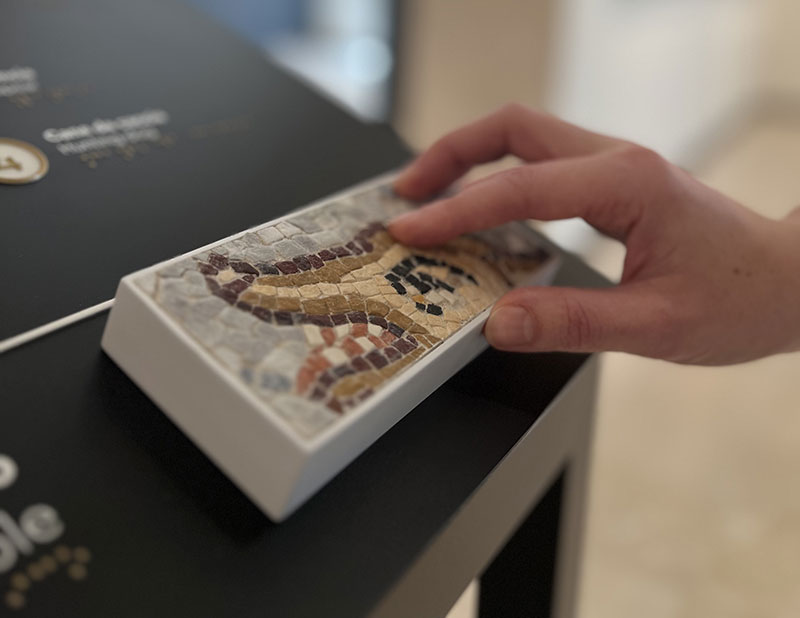 Mosaico: raffigura una scena di caccia al cinghiale, e la stazione è progettata in modo tale da trasmettere chiaramente la narrazione ed evidenziare le lacune presenti nel mosaico originale. Il dispositivo comprende un’illustrazione tattile della scena e un campione reale di tessere di mosaico, che consente ai visitatori di percepire la consistenza originale del supporto.