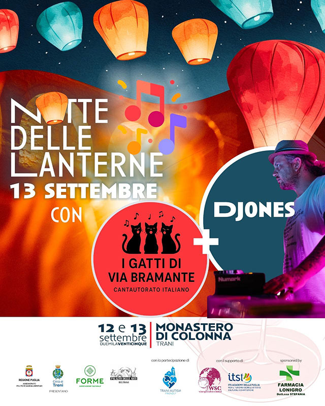 Un’ultima notte di fine estate dedicata alle eccellenze pugliesi e al loro legame con il territorio, quella che domani 13 settembre, tra calici di vino pregiato e cibo sostenibile a km 0, scalderà il Monastero di Colonna a Trani per la quinta edizione della “Notte delle Lanterne”.