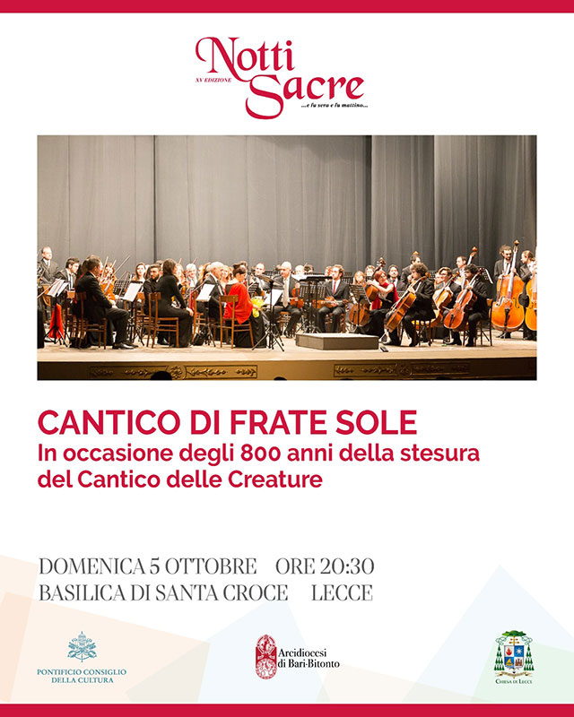L’omaggio è a San Francesco e alla sua spiritualità universale con la terza tappa leccese della terza edizione di “Notti sacre”, rassegna di musica sacra nata a Bari da un’idea di monsignor Antonio Parisi, e giunta a Lecce alla sua terza edizione.
