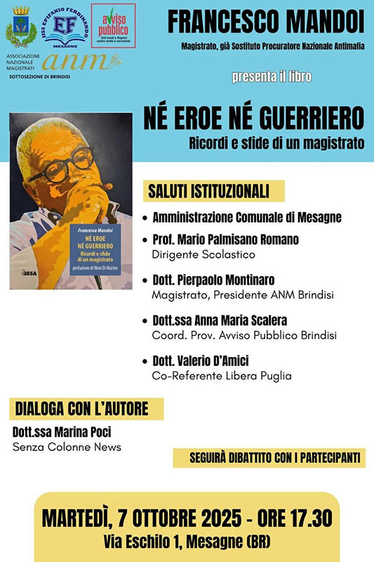 MESAGNE (Brindisi) – Martedì 7 ottobre, dalle ore 17.30 presso la sede dell’Istituto di Istruzione Secondaria Superiore “Epifanio Ferdinando” di Mesagne, in via Eschilo, il magistrato Francesco Mandoi, già Sostituto Procuratore Nazionale Antimafia e Antiterrorismo, presenterà il suo libro “Né eroe né guerriero – Ricordi e sfide di un magistrato” (Besa Editrice, 2025).