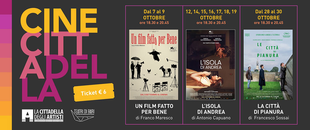 Tre film italiani apprezzati nell’ultima edizione dei festival cinematografici di Cannes e di Venezia arrivano alla Cittadella degli artisti di Molfetta. Dal 7 al 30 ottobre prosegue la rassegna di cinema Cine Cittadella al laboratorio urbano, con doppia proiezione alle 18.30 e alle 20.45.