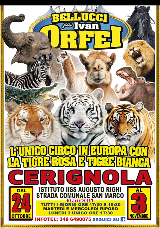 Da venerdì 24 ottobre a lunedì 3 novembre, in strada comunale San Marco nei pressi dell’Iis Righi Augusto a Cerignola (Fg) farà tappa lo spettacolo del Circo Bellucci, con uno spettacolo nuovo, per grandi e piccini, impreziosito dalla collaborazione della compagnia di Ivan Orfei.