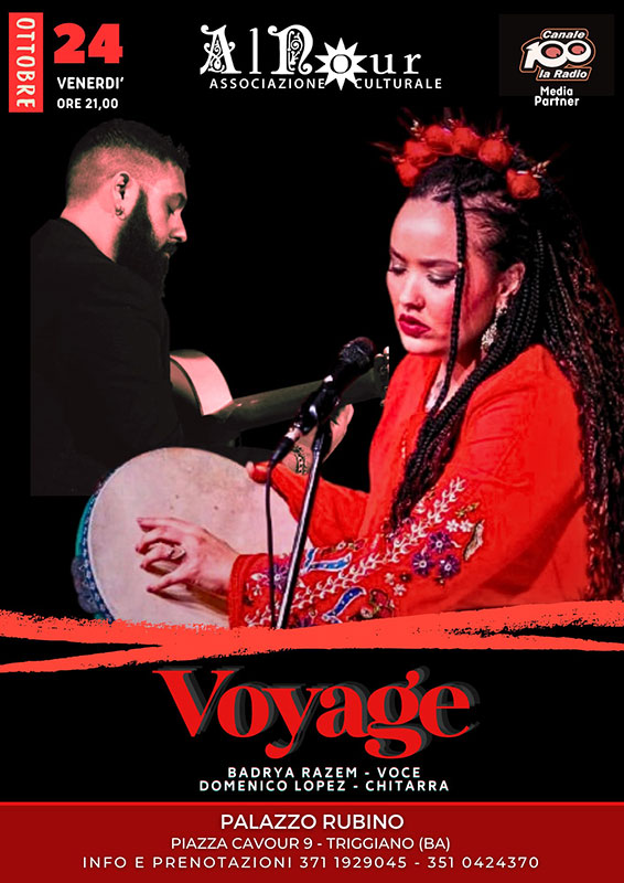 Venerdì 24 ottobre, alle ore 21.00, a Palazzo Rubino di Triggiano, l’associazione Al Nour, diretta da Angela Cataldo, proporrà il concerto “Voyage”, un viaggio musicale che attraversa terre, epoche e culture, con protagonisti la cantante Badrya Razem e il chitarrista Domenico Lopez.