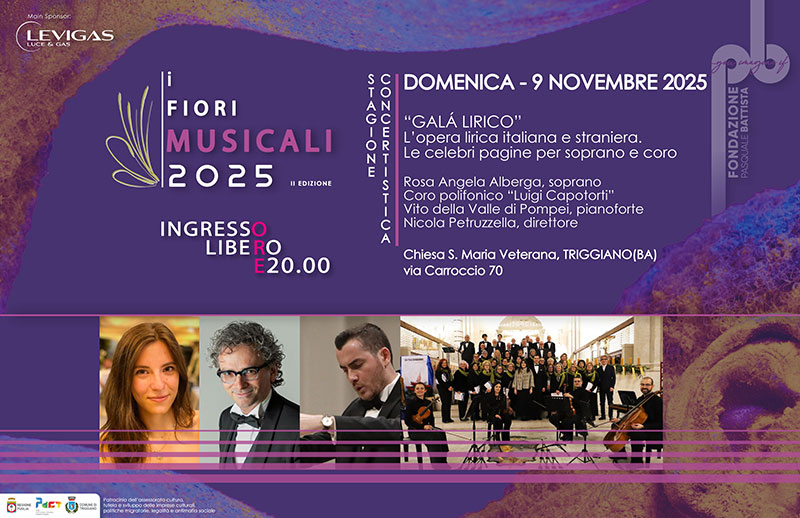 Un florilegio di famose arie e pagine corali tratte dal grande repertorio melodrammatico, da Verdi a Puccini, da Mozart a Donizetti, da Rossini a Bizet. È la proposta della Fondazione Pasquale Battista intitolata allo storico di Triggiano che per oltre cinquant’anni ha contribuito alla valorizzazione dell’eredità culturale della propria città. L’appuntamento con il «Galà lirico», in programma a ingresso libero domenica 9 novembre, alle ore 20, nella Chiesa Santa Maria Veterana di Triggiano, chiude la seconda edizione della stagione concertistica «I Fiori Musicali» firmata da Nicola Petruzzella, che dirige un cast composto dal soprano Rosa Angela Alberga, dal Coro polifonico «Luigi Capotorti» e dal pianista Vito della Valle di Pompei.