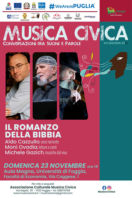 Domenica 23 novembre, alle ore 19.00, nell’Aula Magna della Facoltà di Economia dell’Università di Foggia (via Caggese, 1 – Cavalli Stalloni), la XVI edizione di Musica Civica – Conversazioni tra suoni e parole presenta “Il romanzo della Bibbia”, un affresco narrativo e musicale che porta alle origini della nostra cultura attraverso parola, canto, musica ed immagini. Sul palco Aldo Cazzullo, autorevole voce narrante, Moni Ovadia, leggendario maestro di letture e canti, e Michele Gazich, polistrumentista e poliedrico interprete delle musiche dal vivo. Cazzullo e Ovadia intrecciano un dialogo che è racconto, meditazione e memoria collettiva. Cazzullo ripercorre gli episodi fondativi dell’Antico Testamento (la Creazione, l’Arca di Noè, Abramo, la profezia di Isaia, ecc.), mentre Ovadia dà vita ai personaggi con letture e canti che riportano alla luce il profondo legame tra testo sacro e tradizione orale. Un viaggio nelle radici della nostra civiltà, che mostra come la Bibbia, pur essendo un testo fondativo e antichissimo, continui a parlare alla modernità con una voce sorprendentemente attuale.