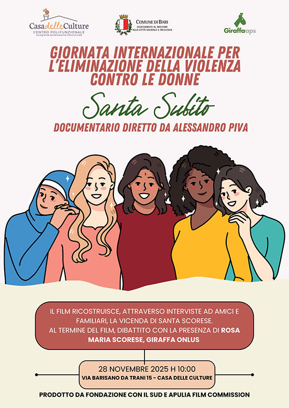 Venerdì 28 novembre, alle ore 10, negli spazi del centro polifunzionale Casa delle Culture, in via Barisano da Trani, sarà proiettato il docufilm “Santa subito”, diretto da Alessandro Piva che ricostruisce, attraverso interviste ad amici e familiari, il femminicidio di Santa Scorese, uccisa a soli 23 anni. Al termine in programma un dibattito con la testimonianza di Rosa Maria Scorese, sorella di Santa e socia dell’associazione GIRAFFA che da anni è impegnata sul territorio con il centro antiviolenza “Paola Labriola”.