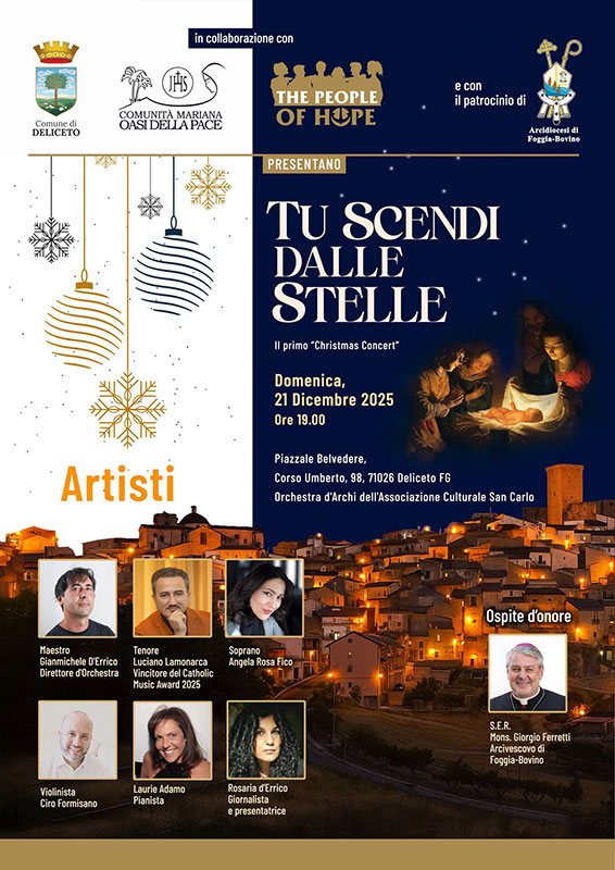 DELICETO – Un concerto-evento di livello internazionale per celebrare “Tu scendi dalle stelle”, il canto di Natale più celebre del mondo, composto da Sant’Alfonso Maria de’ Liguori nel Natale del 1744 a Deliceto. Ed è proprio a Deliceto che, il 21 dicembre,si terrà il primo “Christmas Concert” alle ore 19. Il Piazzale Belvedere, dove per l’occasione sarà allestita una moderna struttura al coperto, ospiterà una parata di stelle della musica lirica: a cominciare da Luciano Lamonarca, tenore italoamericano apprezzato in tutto il mondo che, dal 2008, vive negli Stati Uniti. Vincitore del Catholic Music Award nel 2025, si è esibito all’Assemblea generale delle Nazioni Unite, al Lincoln Center, al Carnegie Hall e al Madison Square Garden.Il tenore, che da giovanissimo iniziò la sua formazione musicale a Ruvo di Puglia, sarà diretto dal Maestro Gianmichele D’Errico e sul palco, assieme a lui, ci saranno la soprano Angela Rosa Fico, il violinista Ciro Formisano e l’Orchestra d’Archi dell’Associazione San Carlo di Napoli. Ospite d’onore della serata sarà Monsignor Giorgio Ferretti, Arcivescovo di Foggia-Bovino.