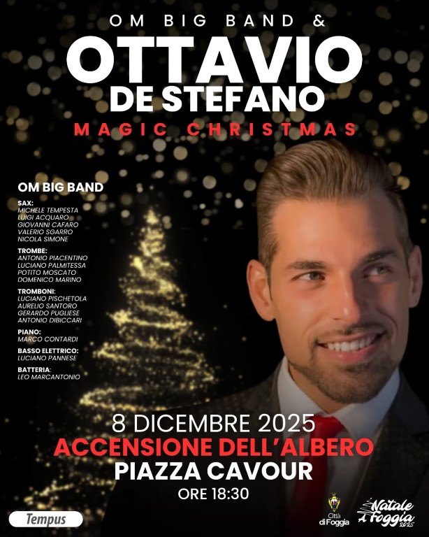 Non c’è festività dell’Immacolata senza l’attesa accensione dell’albero e senza quelle musiche che, puntuali, riescono a riportarci nella magia del Natale. E quest’anno, a Foggia, quella magia avrà un suono speciale: quello dell’OM Big Band, orchestra di straordinari musicisti del territorio guidata musicalmente dal Maestro Antonio Piacentino, insieme alla voce calda e carismatica di Ottavio De Stefano, per uno spettacolo pensato come un grande abbraccio musicale alla città.