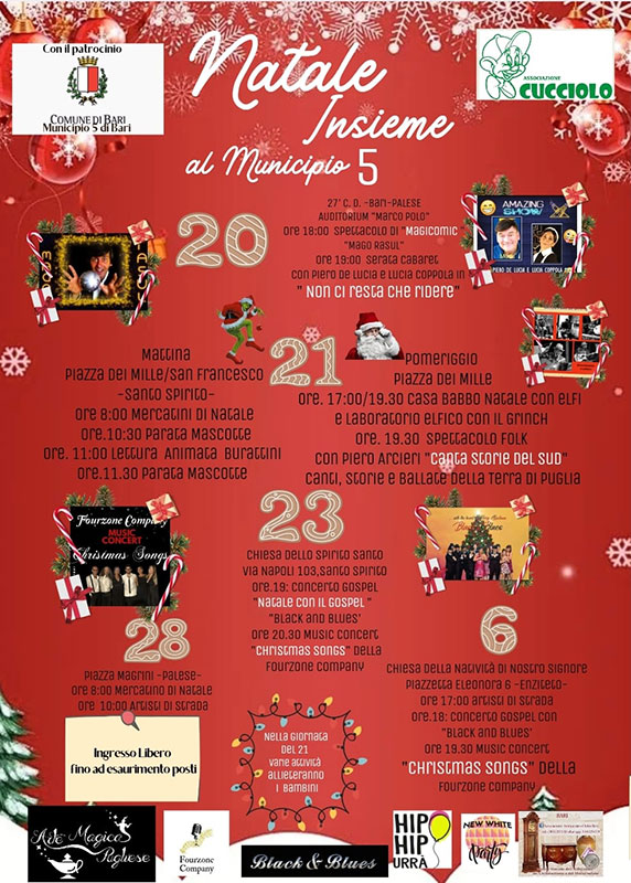 Prenderà il via sabato 20 dicembre, dalle ore 18, nell’auditorium Marco Polo del 27° Circolo Didattico di Palese, il cartellone di appuntamenti “Natale insieme al Municipio V”, promosso dal Municipio V e organizzato dall’associazione socioeducativa e culturale “Cucciolo”.