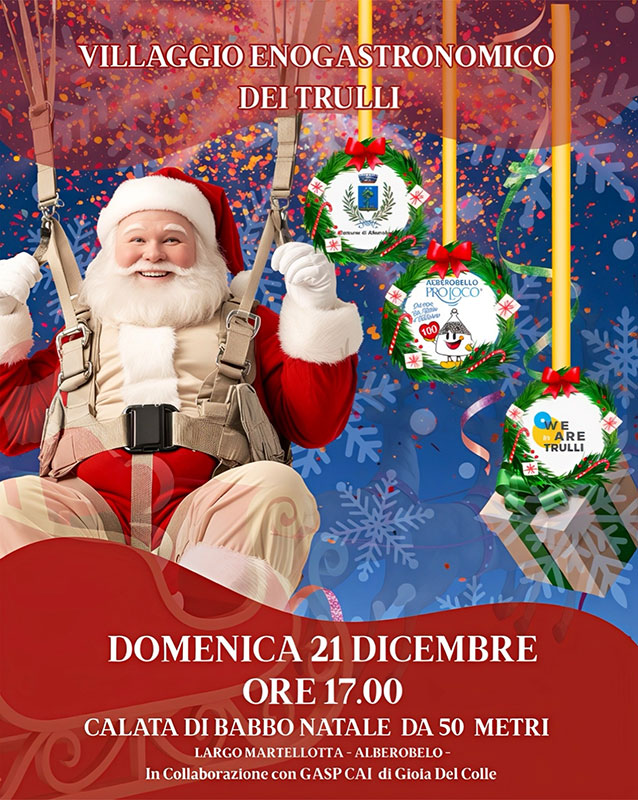 Sempre alle ore 17:00, in Largo Martellotta, si terrà la suggestiva calata di Babbo Natale, a cura della Pro Loco di Alberobello, in collaborazione con il GASP – CAI di Gioia del Colle: uno spettacolo emozionante che incanterà grandi e piccini nel cuore dei Trulli.