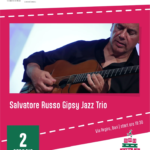 Il sesto concerto gratuito del cartellone è in programma venerdì 2 gennaio, a partire dalle ore 18.30, e vedrà come ospite Salvatore Russo Gipsy Jazz Trio, composto da Salvatore Russo (chitarra solista), Ivan Romanazzi (chitarra ritmica) e Pierluigi Balducci (basso acustico). I musicisti proporranno un repertorio jazz manouche nello stile francese del grande chitarrista Django Reinhardt, leggenda della chitarra jazz mondiale vissuto in Francia nella prima metà del ‘900. La scaletta, ricca di melodie supportate da un forte carattere ritmico come da tradizione gitana, prevede l’esecuzione di brani in diversi stili come swing, rumba e bossa gitana, bolero e jazz waltz.