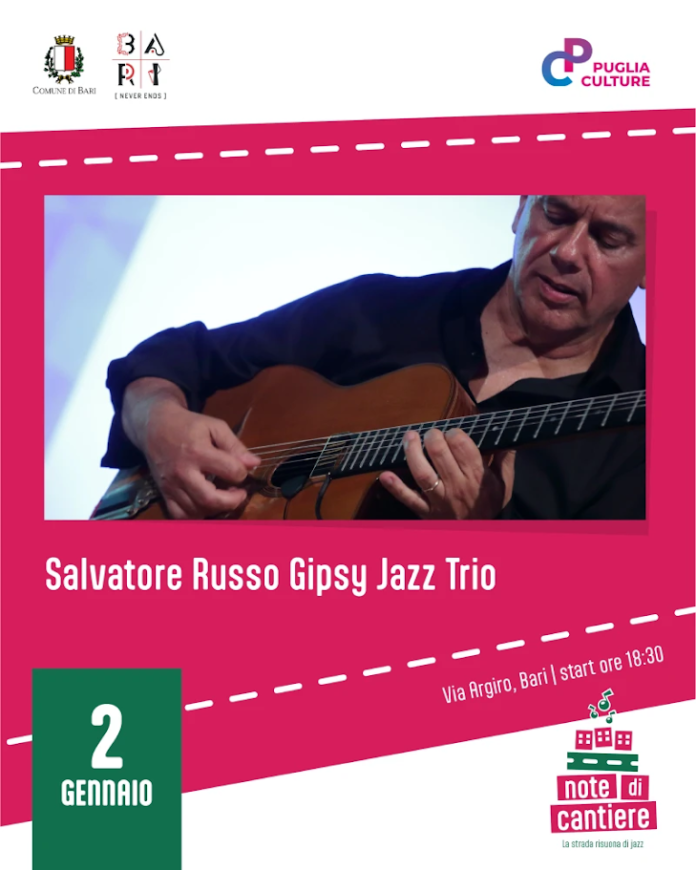“Note di Cantiere”: venerdì 2 gennaio Salvatore Russo Gipsy Jazz Trio per il sesto appuntamento del cartellone di concerti gratuiti