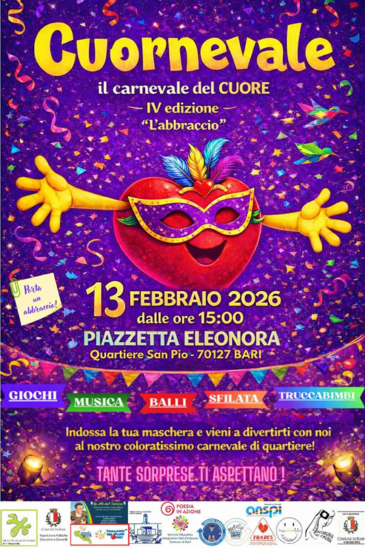 · martedì 17 febbraio, nel Municipio 2, dalle ore 16.00 alle 18.30, presso la Biblioteca Cagnazzi (via Giovanni Colella 13), la Festa di Carnevale conclusiva del progetto “Intrecci di Natale”. Un pomeriggio di colori, musica e allegria pensato per tutte le età, che celebra i legami costruiti tra bambini, famiglie, anziani, volontari e associazioni del territorio. L’iniziativa rappresenta un’occasione di incontro e condivisione, nel segno della comunità, dell’inclusione e di un welfare inteso come esperienza concreta di vicinanza e partecipazione attiva.