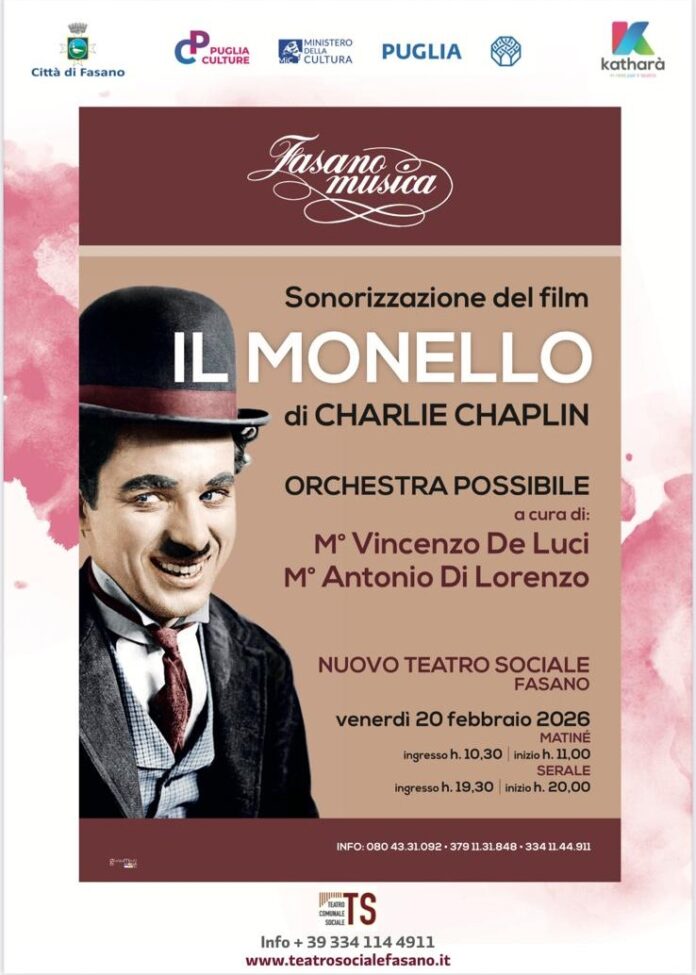 Venerdì 20 febbraio 2026 il Nuovo Teatro Sociale di Fasano accoglie uno degli appuntamenti più significativi della stagione, una serata in cui cinema e musica si incontrano per restituire nuova vita a un capolavoro assoluto della storia del muto. “Il Monello” (The Kid, 1921), primo lungometraggio di Charlie Chaplin e opera cardine della sua poetica, torna sul grande schermo accompagnato dalla sonorizzazione dal vivo affidata all’Orchestra Possibile, ensemble che si distingue nel panorama internazionale per la qualità artistica e per la sua forte vocazione sociale. Il film, scritto, diretto, interpretato e musicato dallo stesso Chaplin, fu un successo straordinario già all’epoca e conserva intatta la sua potenza espressiva, tanto da essere considerato uno dei vertici della produzione chapliniana.