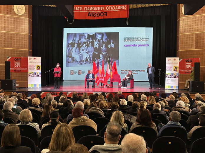 FOGGIA – Un Teatro del Fuoco gremito, giovedì 19 marzo, ha ricordato la lezione ancora attualissima di Carmela Panìco, donna di Cerignola che ha fatto la storia della Cgil in Capitanata. A ricordarne modernità, forza e visione è stato lo SPI Cgil Foggia, sindacato delle pensionate e dei pensionati, nell’ambito della serata-evento significativamente intitolata “La memoria parla al futuro. Donne Protagoniste”. Ad ascoltare la sua storia, anche tanti giovani e, tra questi, Alice Amatore, assessore alla Cultura del Comune di Foggia, intervenuta per ricordare quanta strada è stata fatta grazie al protagonismo femminile nella politica e quanta ce n’è ancora da fare sul cammino della parità di genere. L’evento è stato aperto dalla relazione di Carlo D’Andrea, segretario generale SPI Cgil Foggia, e dall’intervento di Gianni Palma, segretario generale Cgil Foggia. Sentite e commosse le parole di Madia D’Onghia, docente di Diritto del Lavoro dell’Università di Foggia e quelle della professoressa Filomena Cordone, che hanno preceduto l’intervento di Tina Pizzolo, segretaria SPI Cgil provinciale di Foggia. A tracciare un ricordo di “Carmelina”, anche le parole del giornalista Geppe Inserra.