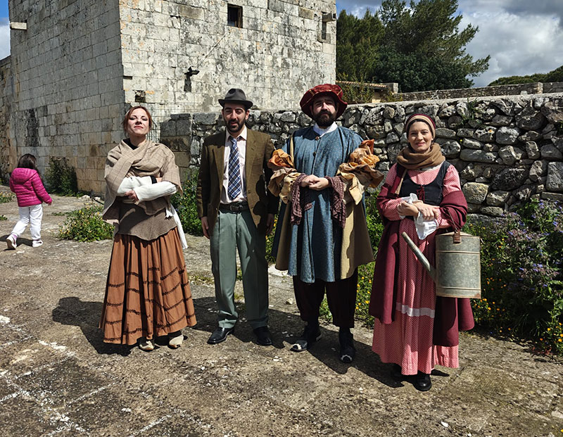 Il percorso prende vita tra le strade del borgo, dove il pubblico cammina insieme agli attori in abiti d’epoca, seguendo figure e vicende che emergono lungo il tragitto. Le tappe toccano alcuni luoghi simbolo: le chiese storiche, il Parco delle Pozzelle e la Masseria Pozzelle. Ogni sosta introduce racconti, episodi, leggende, restituendo uno sguardo vivo sulla quotidianità e sulle memorie del territorio. La visita assume la forma di un racconto condiviso, in cui chi partecipa diventa parte della scena. Il borgo si trasforma in spazio narrativo, capace di accogliere e mettere in relazione storie, persone e paesaggio. La mattinata prosegue alla Masseria Pozzelle con un laboratorio di aquiloni pensato per i più piccoli e un aperitivo rurale a cura dell’associazione Karadrà, occasione di incontro che rinsalda il legame con il territorio.